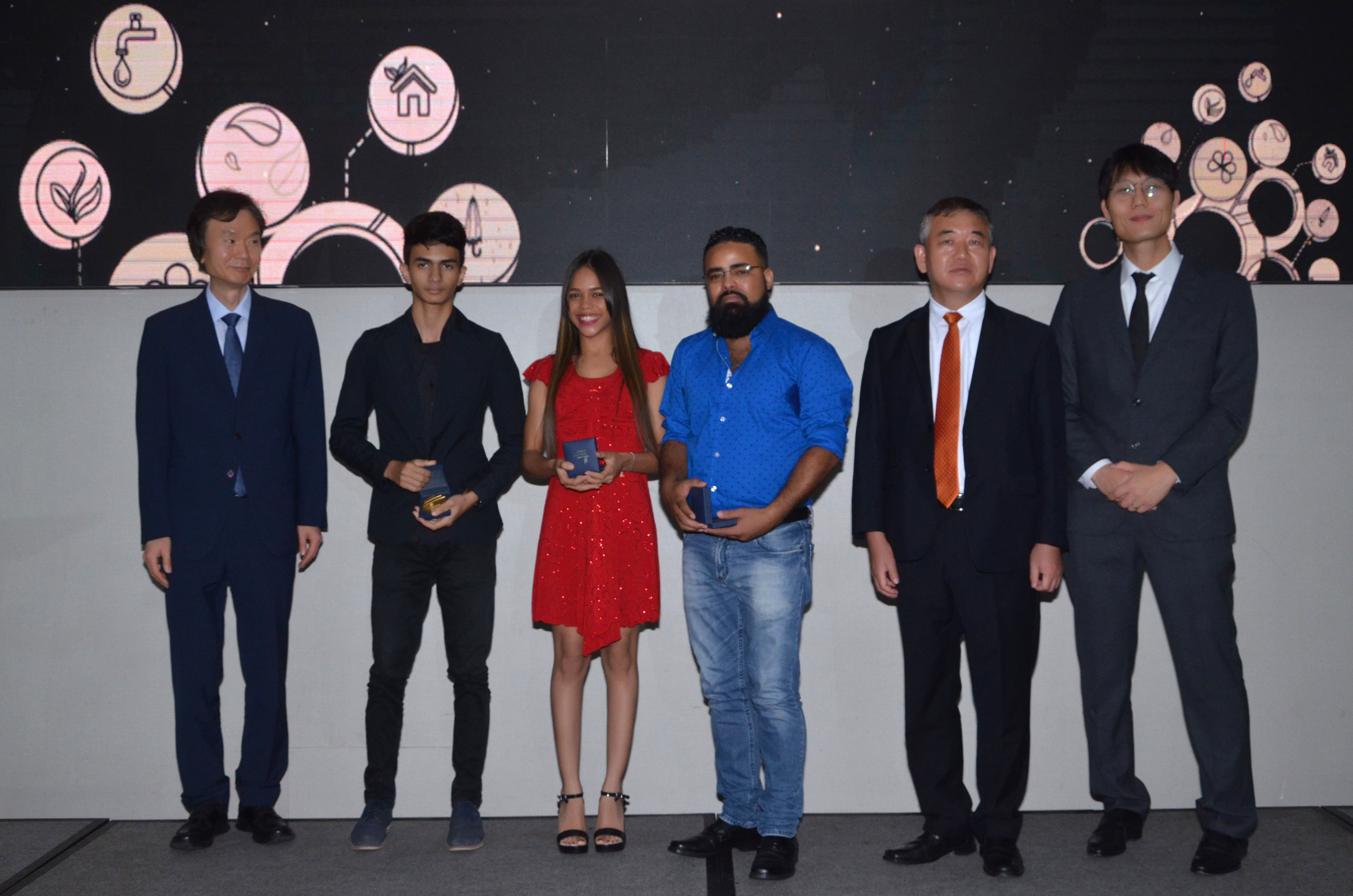 El Sr. Jaewon Bahn, consejero de OMPI, Enmanuel Henríquez, ganador del 1er lugar de la Competencia de Tecnología Apropiada, Stacy Carrie Santana, representante del equipo ganador del 2do lugar, Joel de la Cruz, ganador del 3er lugar, el Sr. Byeong-Yeon KIM, Embajador de Corea en la República Dominicana y el Sr. Won Seok HUH, subdirector de Asuntos Multilaterales de KIPO.