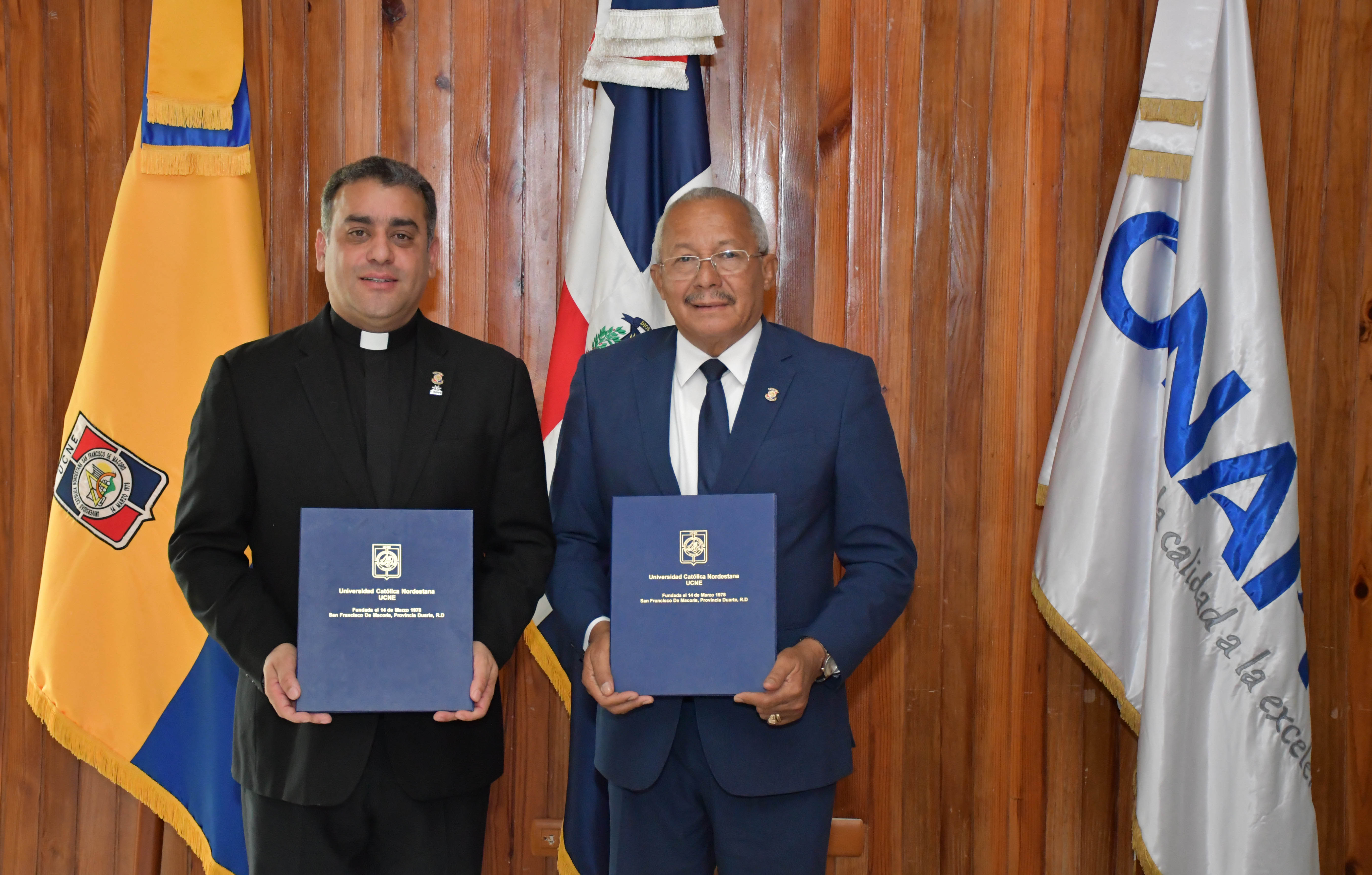 Por la UCNE se dieron cita en la firma del acuerdo de intercambio educacional, Rvdo., P. Dr. Isaac García Cruz, rector, también Martín Ortega Then, Juan Castillo Castillo, Freddy Martínez, Raysa Gilbert, Carmen Monegro, Borja Capote, Claribel Polonia y Maridalia Lora.